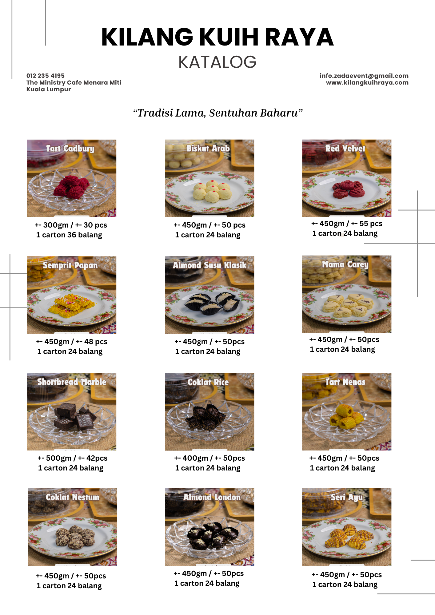 Pelbagai jenis kuih raya dengan harga murah seperti kuih tart, semperit, red velvet, almond london, dan banyak lagi — sesuai untuk jualan semula.